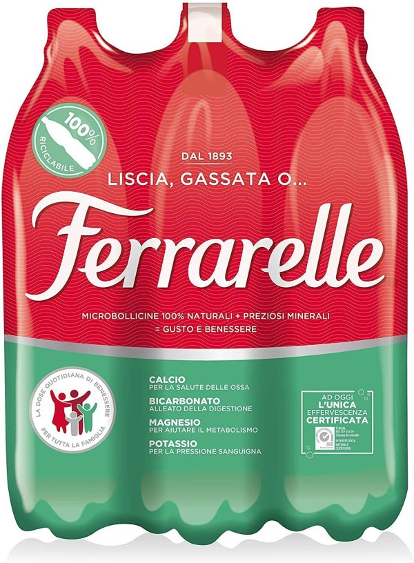 L?’acqua Ferrarelle sgorga da antichissime fonti nel territorio di Riardo, in provincia di Caserta. Durante il suo percorso sotterraneo, lungo almeno 10 anni, l?acqua si arricchisce di anidride carbonica che, con la sua pressione, ne determina la fuoriuscita spontanea dal terreno. E? un?acqua carbonica-bicarbonato-calcica. Imbottigliata come sgorga dalla fonte, Ferrarelle contiene una quantit? equilibrata di anidride carbonica che, combinata con il bicarbonato e il calcio, le conferisce un gusto unico. Il gusto unico, morbido e dolce di Ferrarelle e la sua effervescenza, vellutata al palato, esaltano il sapore di ogni tipo di piatto